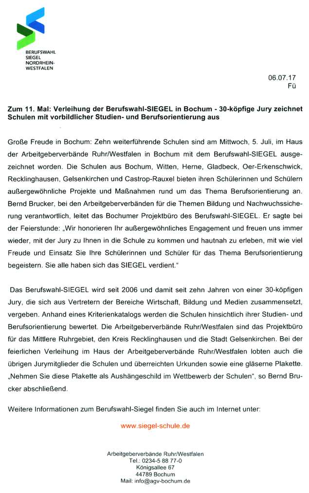 Pressemitteilung der Arbeitgeberverbände Ruhr/Westfalen, Bochum, vom 06.07.2017: